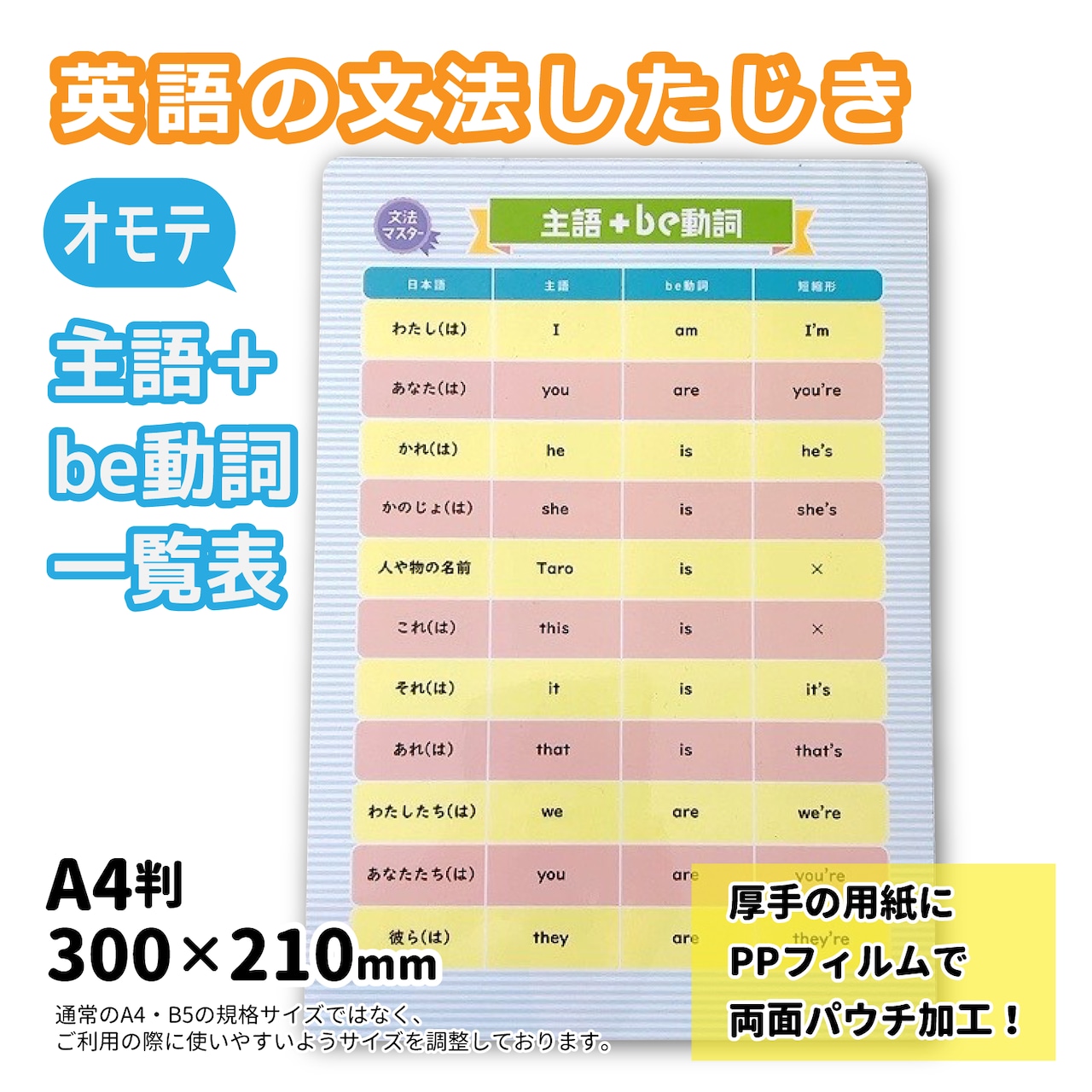 オモテ面には「主語+be動詞一覧表」を見やすくデザインしてあります。なかなか覚えられないお子さんでも、このしたじきを使っていればいつでも確認できて覚えられること間違いなし!